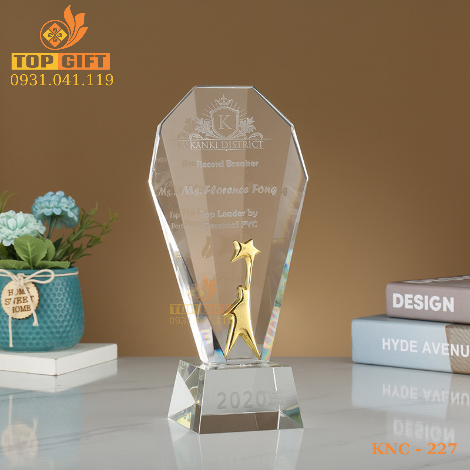 Chế tác từ pha lê cao cấp, có độ trong suốt và bắt sáng hoàn hảo. Thường được khắc laser hoặc in màu để tạo nên hình ảnh sắc nét và chi tiết. Vẻ đẹp tinh tế, sang trọng, phù hợp với các sự kiện hiện đại và trang trọng như lễ trao giải, kỷ niệm thành tựu cá nhân hoặc doanh nghiệp. Dễ dàng tùy chỉnh thiết kế với các hình khối đa dạng: hình tròn, hình vuông, khối lập phương, kim cương. Thường xuất hiện trong các sự kiện vinh danh nhân viên, tri ân đối tác, hoặc kỷ niệm thành tựu quan trọng.