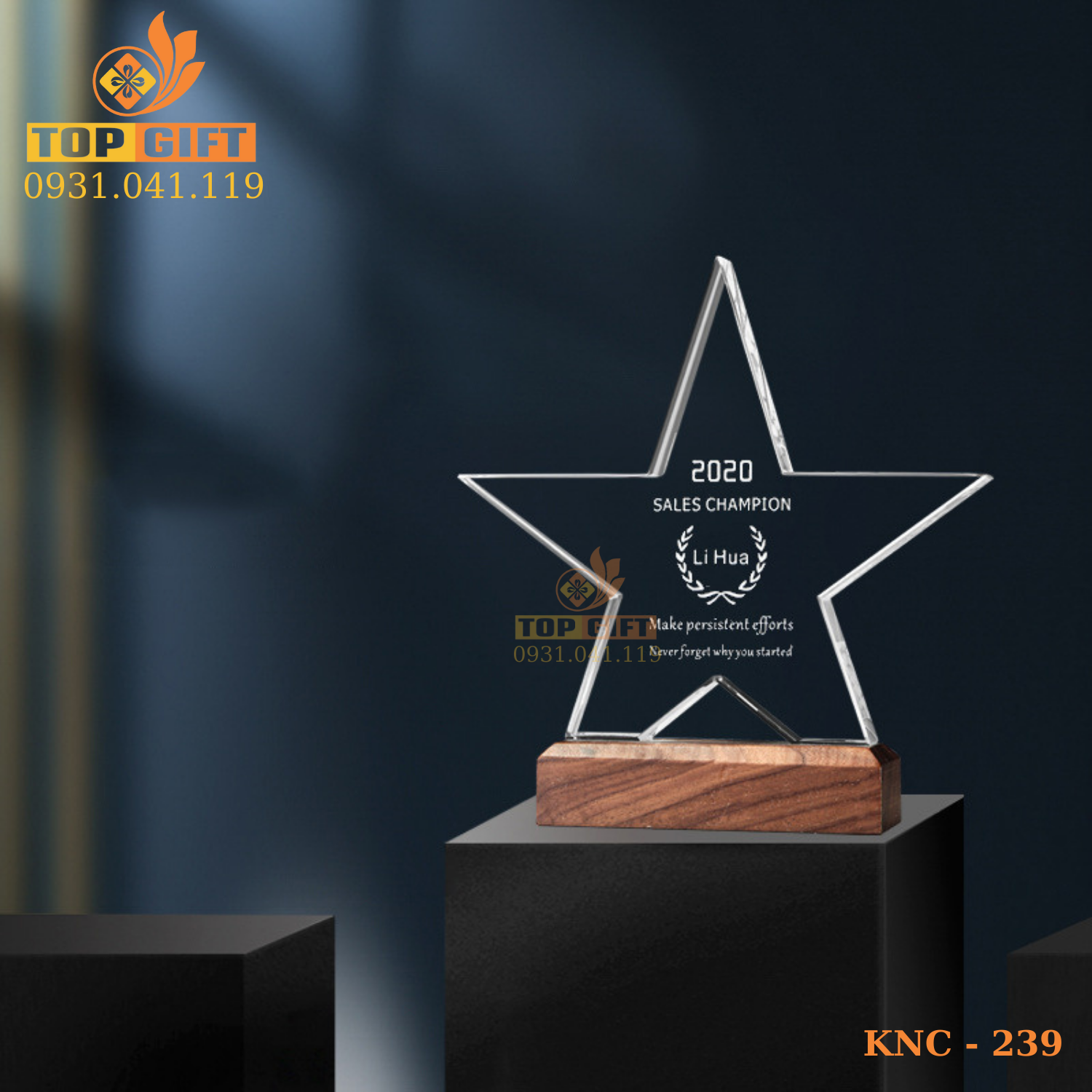 Kết hợp giữa chất liệu gỗ và pha lê, mẫu này mang vẻ đẹp cổ điển và hiện đại. Gỗ tượng trưng cho sự bền vững và gắn bó, còn pha lê biểu hiện sự mạnh mẽ. Dành riêng cho những nhân viên đã cống hiến lâu dài cho doanh nghiệp, thể hiện sự trân trọng đối với những cá nhân có thâm niên.