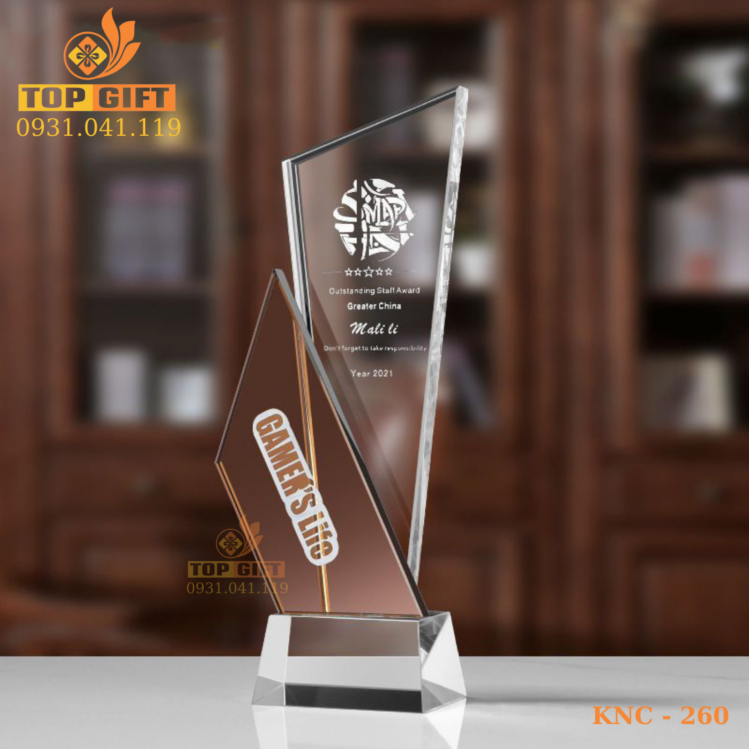 Mẫu kỷ niệm chương pha lê trong suốt với thiết kế tinh xảo, khắc logo và thông điệp của doanh nghiệp. Món quà này thể hiện sự tinh tế và sang trọng. Ghi dấu ấn lâu dài trong lòng khách hàng, đồng thời tạo nên một sự kiện tri ân đặc biệt.