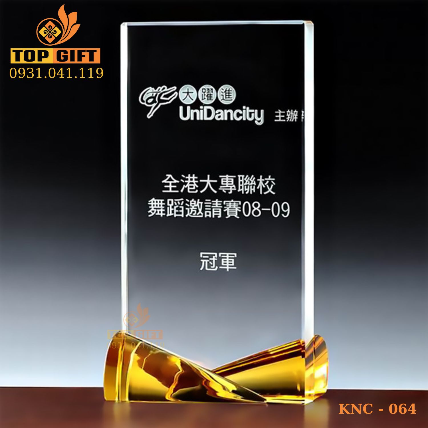 Cũng giống như pha lê, nhưng cúp pha lê được đúc dưới dạng một chiếc cúp, với nhiều hình dáng đặc sắc.